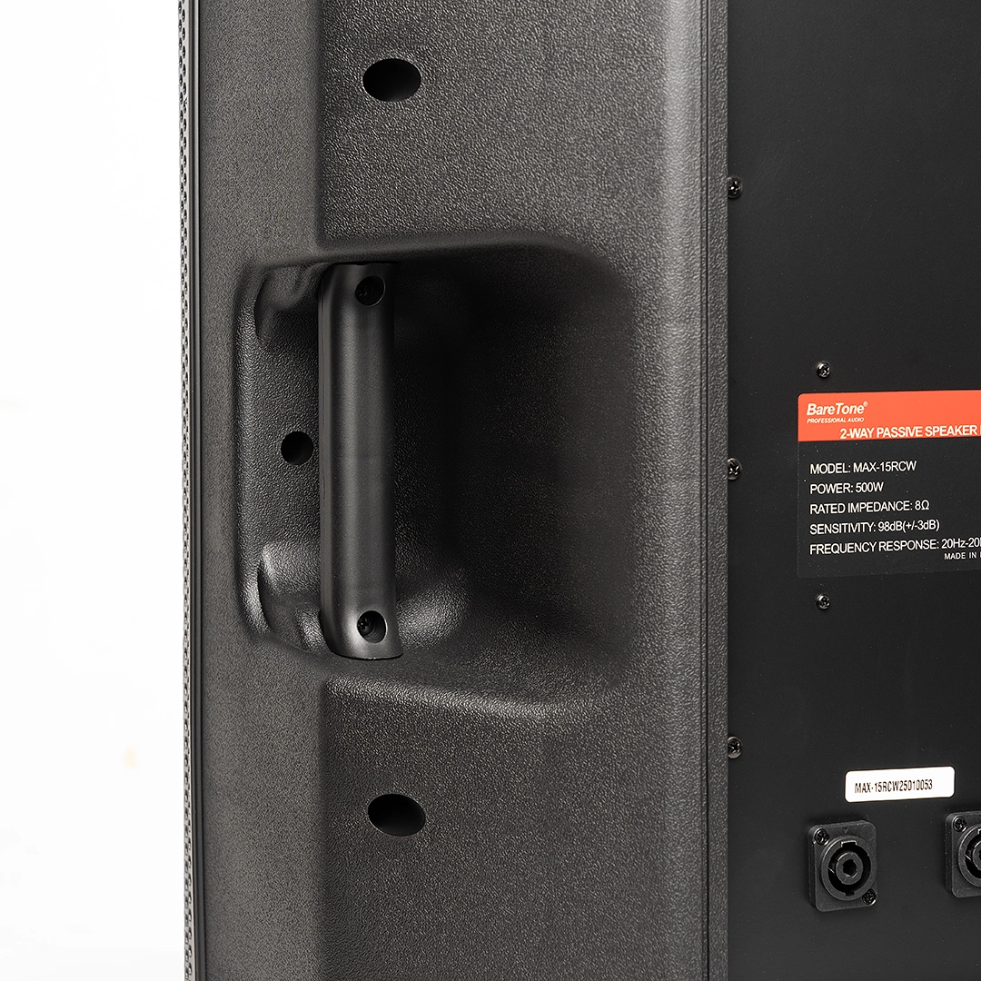 اسپیکر BareTone مدل MAX15RAE با ابعاد حدود 75.5 × 40.5 × 46.5 سانتیمتر جزو اسپیکرهای قابلحمل اما قدرتمند محسوب میشود. بدنه دستگاه از جنس مقاوم و مستحکم طراحی شده تا در جابجاییهای مکرر، حملونقل بین مراسم یا استفاده در فضای باز دچار آسیب نشود.